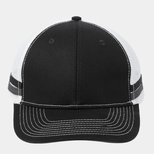 Fabric: 100% cotton twill front panels and stripes; 100% polyester mesh mid and back panels Structure: Structured Profile: Mid Closure: 7-position adjustable snapback